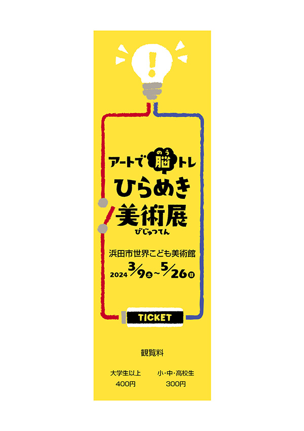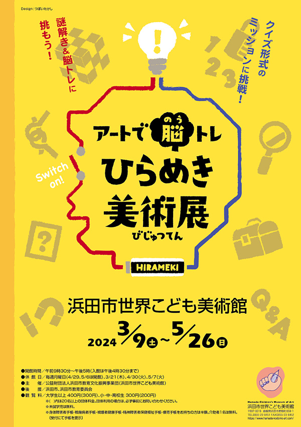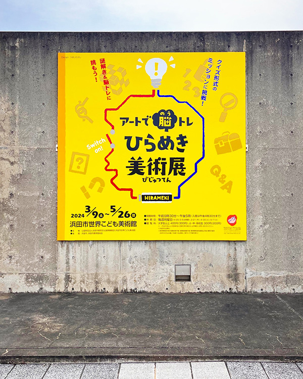 浜田市世界こども美術館 企画展「アートで脳トレ ひらめき美術展」のメインビジュアル、広報物、会場内装デザイン。 浜田市世界こども美術館 |